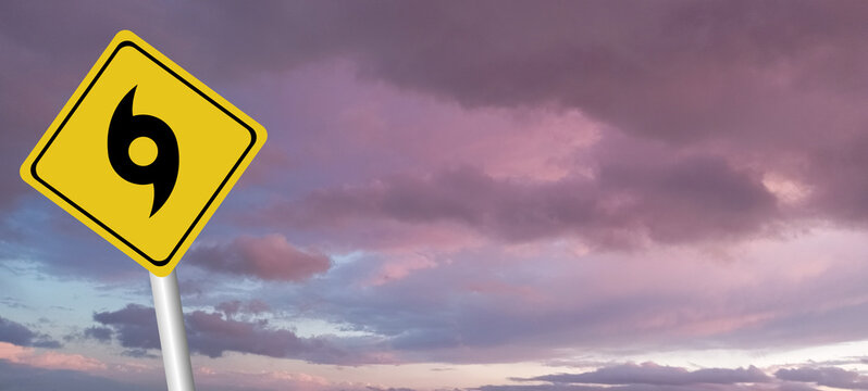 danger,Hurricane Idalia warning sign against a powerful stormy background with copy space. Dirty and angled sign with cyclonic winds add to the drama.hurricane season sign on cloudy background