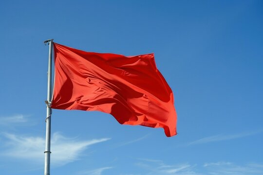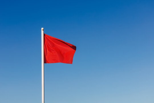 Bright red flag waving on a white flagpole against a clear blue sky. Simple, minimal outdoor signal of alert. Warning sign on the beach