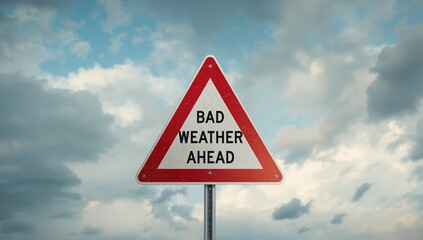 Triangular warning sign in red and white signaling hazardous weather conditions with a partly cloudy sky background for traffic caution, transportation safety