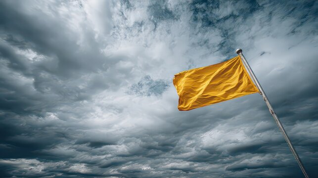 Bright Yellow Flag Against Ominous Grey Cloudy Sky On Windy Day At Coastline