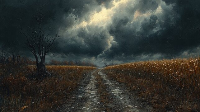 A winding, muddy track cuts through lush cornfields under an ominous sky. Thick dark clouds gather as a summer storm approaches, inspiring both awe and fear in this rural landscape