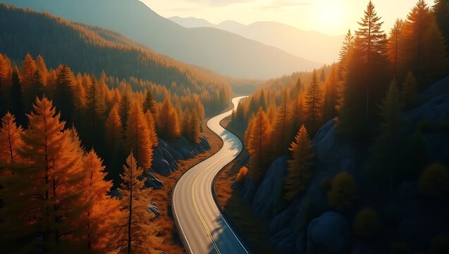 Scenic mountain valley road winding through vibrant autumn forest at sunset