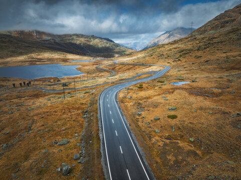 Aerial drone view of wet winding road in the Swiss Alps, Switzerland, with alpine lake, dramatic clouds, golden slopes and rocky terrain on a cold moody autumn day. Top view of mountain alpine road