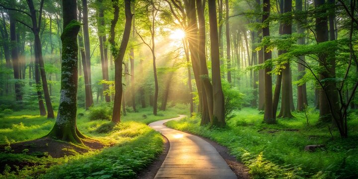 Winding dirt trail glowing at twilight through misty woodland canopy and golden trees