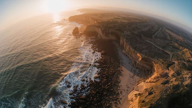 Sunset aerial capturing rugged sandstone cliffs, boulder-strewn shoreline and rolling waves