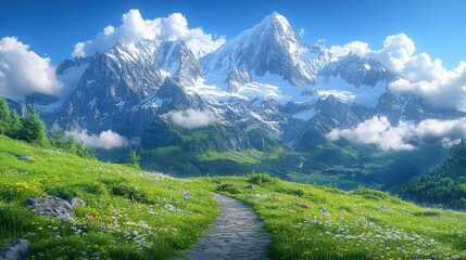 Majestic mountain peaks with snowy slopes and a winding hiking path on a transparent background, PNG image, PNG file