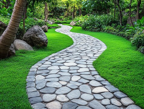 Discover a serene stone pathway winding through lush green grass, inviting you to explore a tranquil landscape and find your way forward.