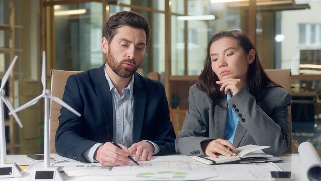 Multinational business team discussing wind turbine project sustainable investment eco energy Korean woman investor windmill Caucasian businessman environmental strategy innovation partnership office