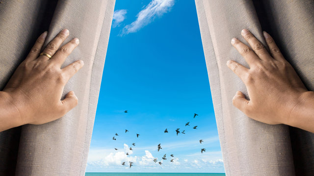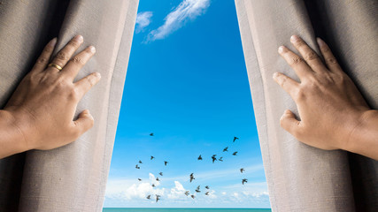 man and hope concept . man opening window curtains and seeing beach under the blue sky