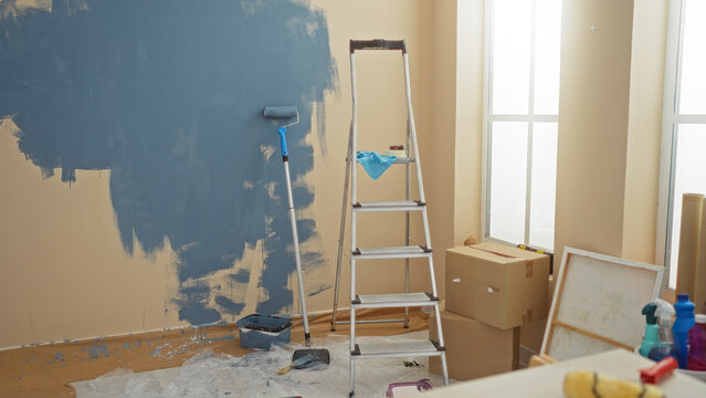 Room undergoing renovation shows paint supplies, ladder, and moving boxes scattered, suggesting a new apartment being prepared for home improvement indoors.