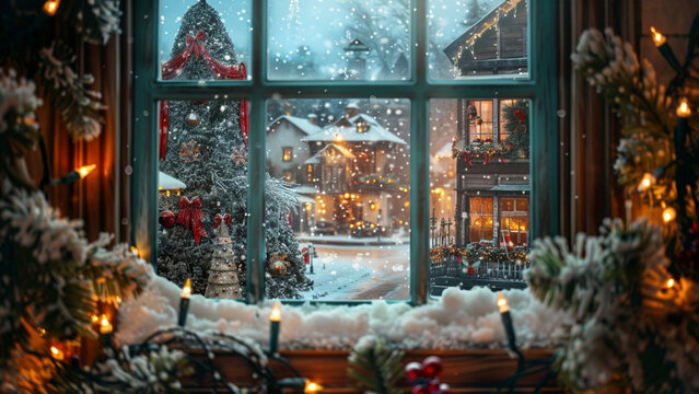 Xmas window decoration with snow outdoors. Celebrate festive concept.