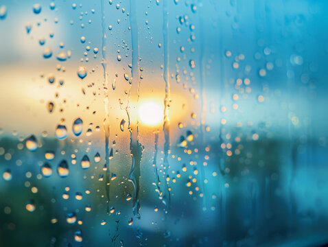 Close up image of raindrops on a window during a summer storm creating a moody vibe ideal for Instagram with a blurred background showing the sky Focus on the wet glass with tiny droplets featuring c