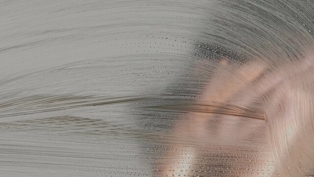 Mysterious question mark forms on fogged glass surface as condensation droplets merge, blurring the background, creating an intriguing abstract composition with eerie ambiance.