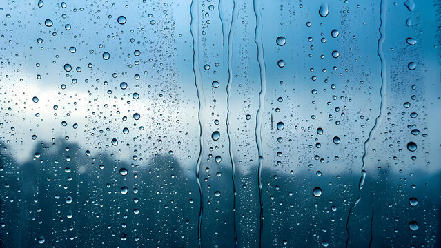 Raindrops on glass window with blurred cityscape in the background. Wet transparent surface covered with water droplets on a rainy day. Abstract weather and nature concept for design and print