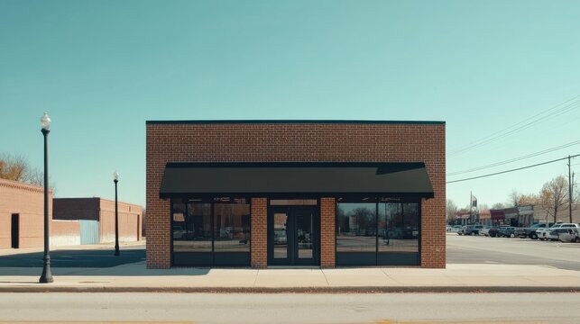 A brick building with a black awning and a window on the front. The building is empty and there are no people in the image. Empty space for logo or text, mockup