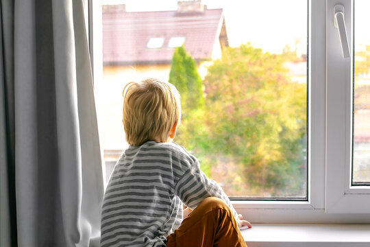 Pensive boy wearing yellow face mask and earbud viewing digital data chart through window