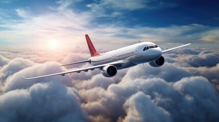 plane wing from airplane window seat in flight nature landscape against scenic sunset sky background. Aerial view from aircraft passenger cabin on beautiful red orange sunrise cloudscape and blue sky