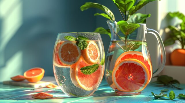 Two glasses of refreshing grapefruit and mint infused water on a blue wooden table with sunlight shining in.