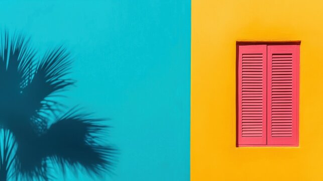 Unique plant shadows on yellow fabric create trendy abstract backdrop with window, curtains, and flowers.