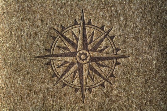 Decaying compass rose amidst rusted metal and graffiti,  dirty,  aged