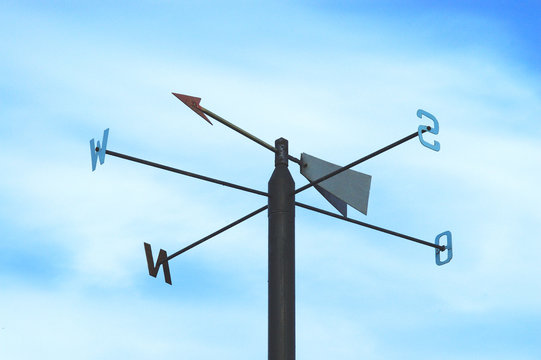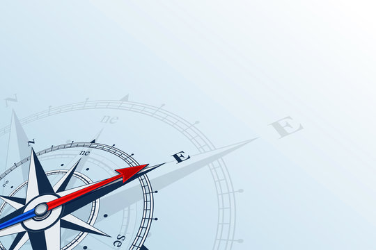 Compass east. Compass with wind rose, the arrow points to the east. Compass on a blue background. Compass illustrations can be used as background. East direction. Flat background with copy space place