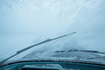 Car windshield wipers and windscreen in snow, closeup