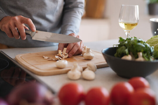 A person is skillfully chopping mushrooms on a wooden cutting board in a warm kitchen. Fresh vegetables and a glass of white wine are nearby, creating a vibrant cooking scene.