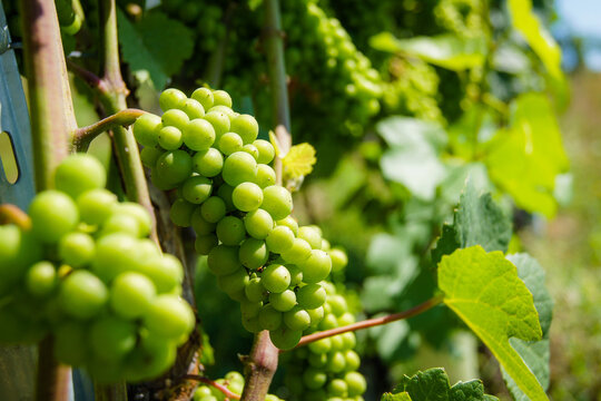 Green grapes growing in a vineyard at Kaiserstuhl, Germany. The grapes are illuminated by golden sunlight.