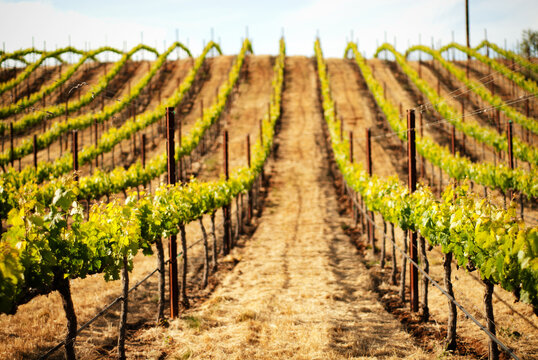 Rows of grapes growing at a vineyard in Napa Valley, California