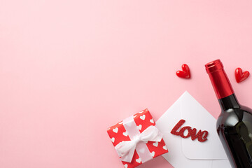 Top view photo of valentine's day decor small hearts giftbox in red wrapping paper with pattern of hearts envelope inscription love and wine bottle on isolated pastel pink background with copyspace