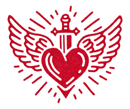 Retro winged red heart pierced by sword transparent image. Vintage tattoo-style love symbol with angel wings isolated cutout. Romantic emblem cut out clipart design element png
