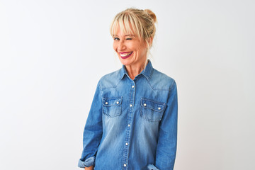 Middle age woman wearing casual denim shirt standing over isolated white background winking looking at the camera with sexy expression, cheerful and happy face.