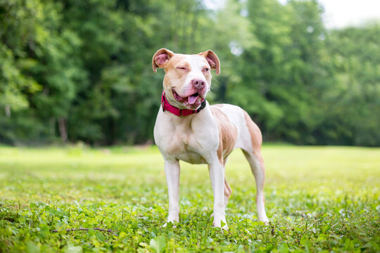 A Pit Bull Terrier mixed breed dog with a funny expression on its face