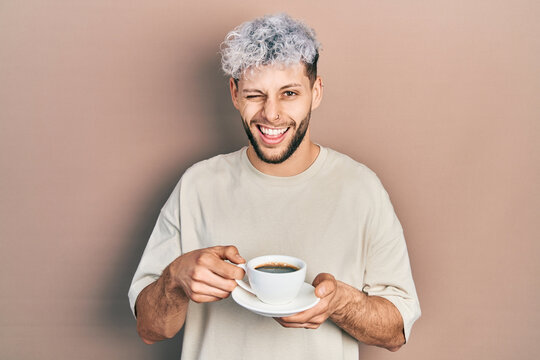 Young hispanic man with modern dyed hair drinking a cup of coffee winking looking at the camera with sexy expression, cheerful and happy face.