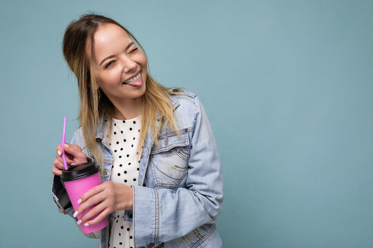 Photo of attractive young happy smiling blonde woman wearing everyday stylish clothes isolated over colourful background wall holding paper cup for cutout drinking tea looking at camera winking and