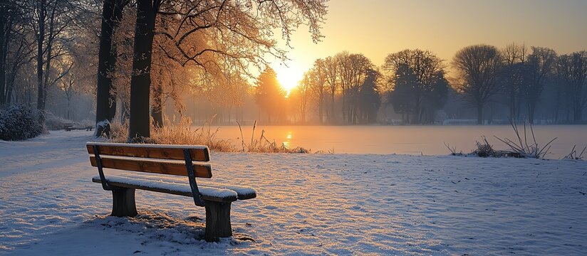Tranquil winter morning scene of a snowy park with a wooden bench by the lake, as the sun rises over frost-covered trees.