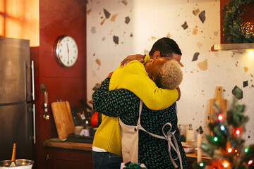 Mother and son hugging in kitchen