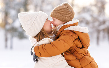 Happy family enjoying snowy weather outdoor, mom with little son hugging during walk in winter park