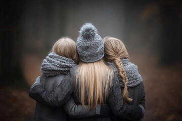 Cute young family with twins and pregnant young mother having fun in winter park on a bright day hugging each other and smiling