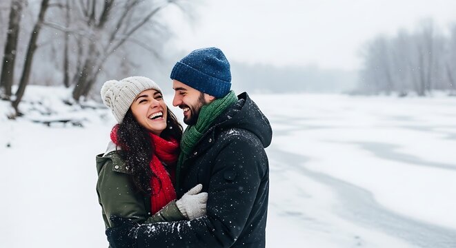 Joyful couple embraces warmly in a snowy winter landscape sharing laughter and affection