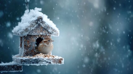 A sparrow perches on a snowy birdhouse, surrounded by falling snow. The frosty scene captures the essence of winter wildlife and cozy shelter.