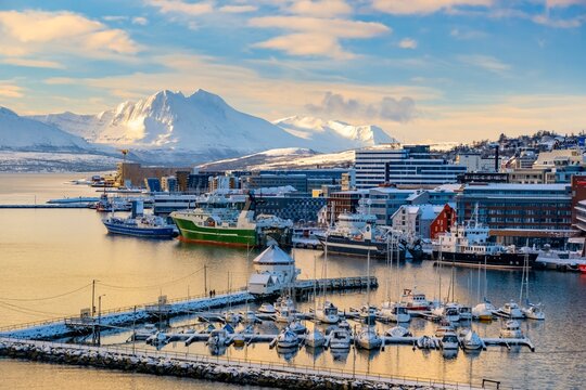 Snow-covered Troms harbor with docked boats and ships, nestled against a backdrop of snow-capped mountains and colorful buildings. A serene winter scene capturing the essence of Norwegian coastal life