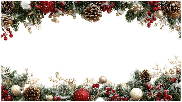 Christmas frame with pine cones and red berries on green branches on transparent background