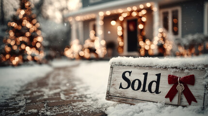 Festive sold sign close to home for sale with key in front of a beautifully decorated door during a snowy winter evening. Real estate agency. Christmas and New Year greetings. With copy space