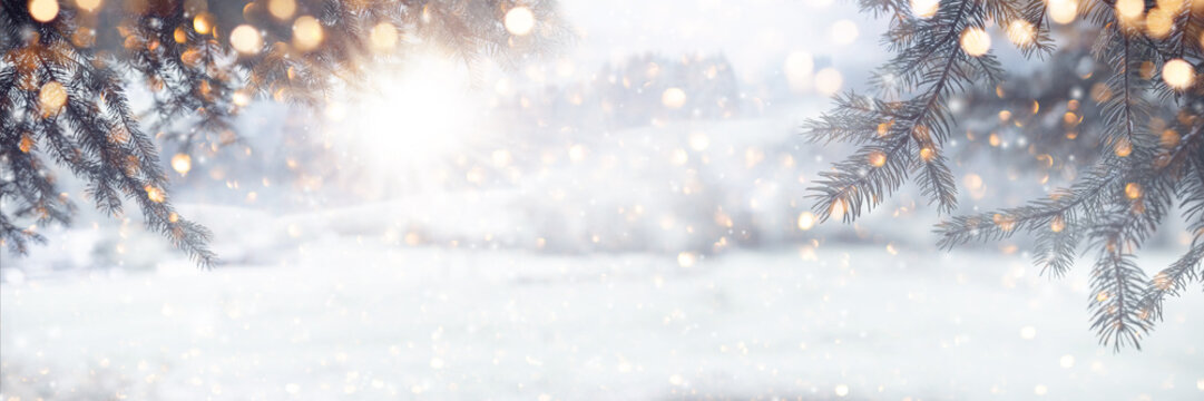 Blurred winter and christmas background with snowy pine branches and abstract golden lights in a festive holiday scene. Horizontal banner with winter design and space for text.