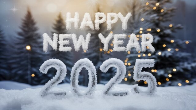 "Warm congratulations on the New Year 2025", written in frosty white text against the background of a cozy winter landscape. Snow-covered pine trees and twinkling lights are visible in the background.