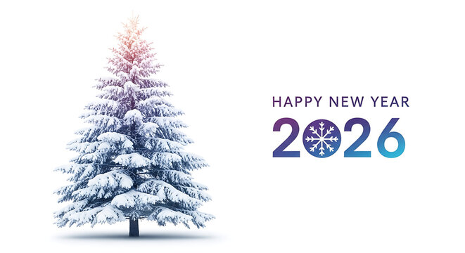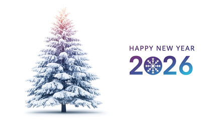 Snowy pine tree with colorful Happy New Year 2026 text on white background, festive holiday season greeting card template with winter landscape