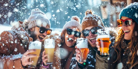 Friends are enjoying their winter vacation by having fun in the snow, taking a break with drinks, and celebrating the holidays in a relaxed and festive atmosphere, creating joyful memories together