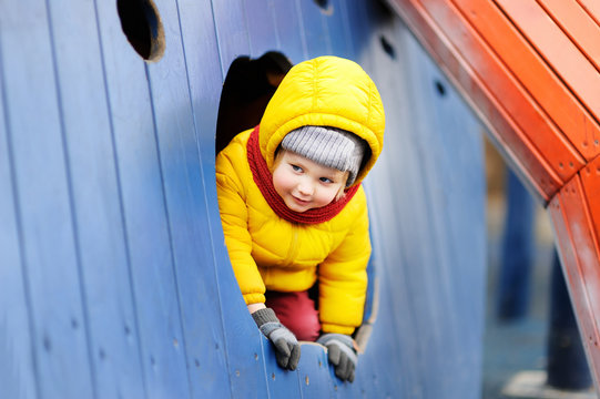 Adorable little boy having fun on a playground on snowy winter day. Cute child wearing warm clothes playing in a snow.