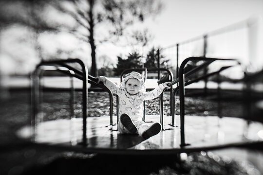 A baby aged 12-17 months , looks into a yellow pipe on the playground in winter